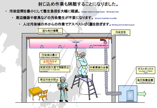 - 低濃度ばく露による被害は一般人に広く浅く拡散する危険が指摘されており、その殆どが設備器周辺に吹き付けられたアスベストといわれ除去が進まない要因となっています。それは技術的要因よりも日常の営みを継続しながら除去する製品・工法がないことが問題であった、この製品により事業主は事業を継続しながら対策を講じることができ、低濃度ばく露の環境改善に貢献しています。