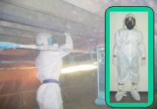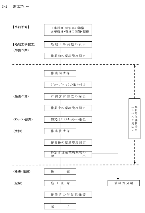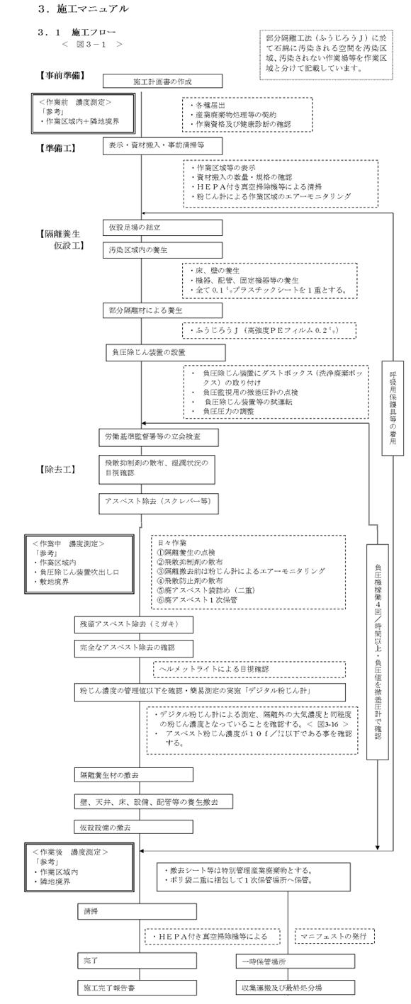 認定基準:従事者の作業場所である作業区域の空気1㍑中の繊維状粒子(アスベスト繊維を含む)の 本数をおよそ10本以下とする事により作業区域の汚染がない事の証明施工手順 - ふうじろう工法