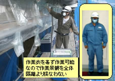 - この工法は汚染域に入らない事で洗浄設備が不要とされ、これによりセキュリティーゾーンやフルフェイス式防塵マスク及び防護服が不要となり、消耗品コストの低減ができます。