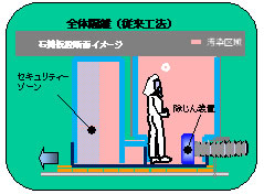 また、従来工法「部屋全体を隔離しての除去工事」では作業員が濃度の高い汚染域に入ることによる石綿ばく露による疾病リスクが高くなるという安全衛生上の問題があります。