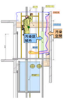 この工法は汚染域に入らない事で洗浄設備が不要とされ、これによりセキュリティーゾーンやフルフェイス式防塵マスク及び防護服が不要となります。